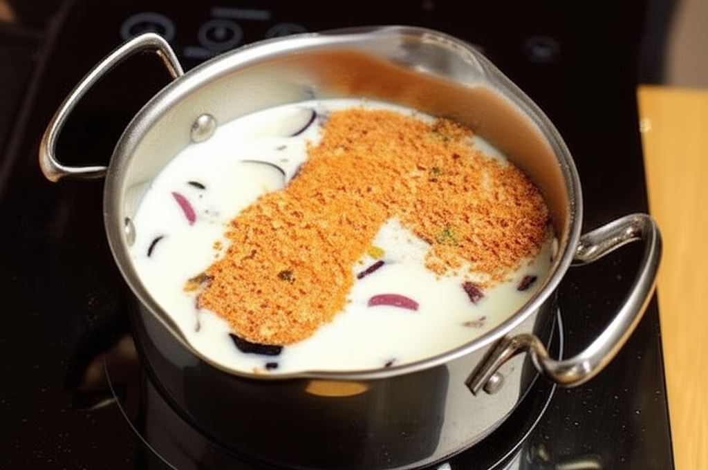 Na oleju, w głębokim garnku, zrumień cebulę, potem wsyp napój sojowy i Fix Knorr. Wszystko starannie zamieszaj.