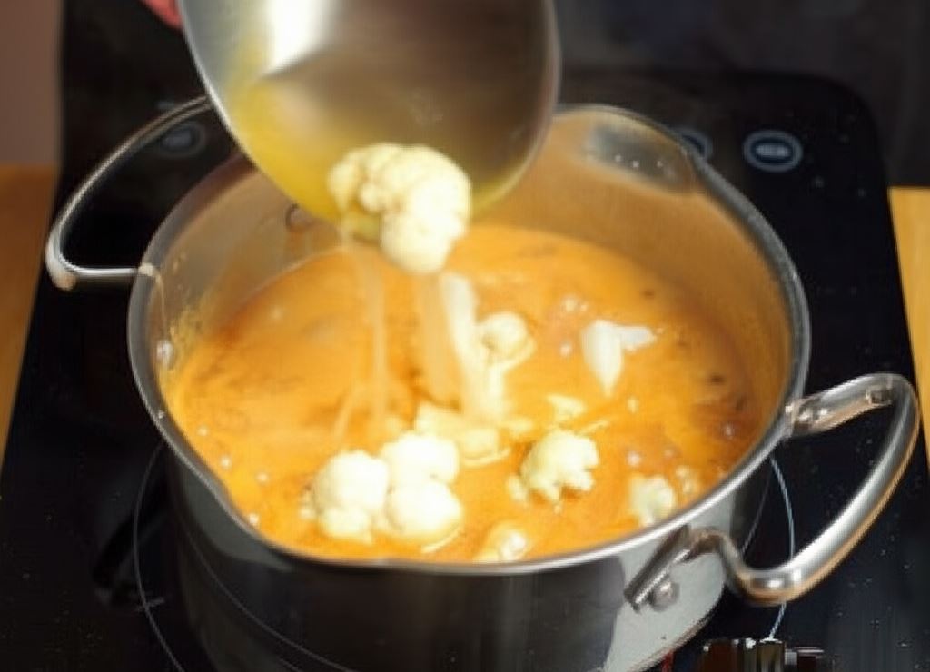 Kiedy sos stanie się gęsty dodaj kalafior i tofu. Całość gotuj przez 5 min.