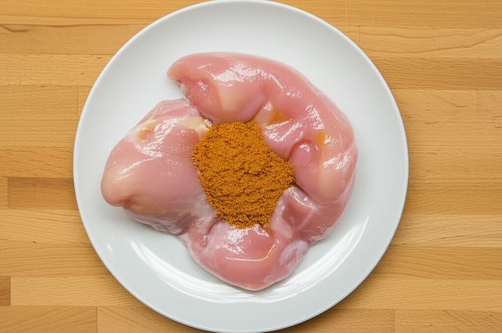 Pierś indyczą natrzyj przyprawą wymieszaną z olejem. Mięso owiń folią aluminiową i odstaw do lodówki na 12 godzin. Po tym okresie włóż mięso do rozgrzanego do 175 °C piekarnika na około 40 minut – sprawdź czy jest upieczone, jeśli istnieje taka potrzeba wydłuż pieczenie o 10-20 minut, będzie to zależało od rozmiaru piersi. Upieczonego indyka ostudź i pokrój na cienkie plastry.