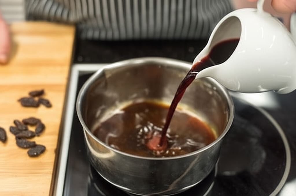 Naczynie z sokami, w którym pieczony był indyk, zalej winem, wsyp rodzynki i gotuj moment, aby aromaty przeniknęły do wina. Wywar przecedź przez lniane płótno, połącz z żelatyną i odstaw do ostygnięcia. Rodzynki zachowaj do nadzienia.