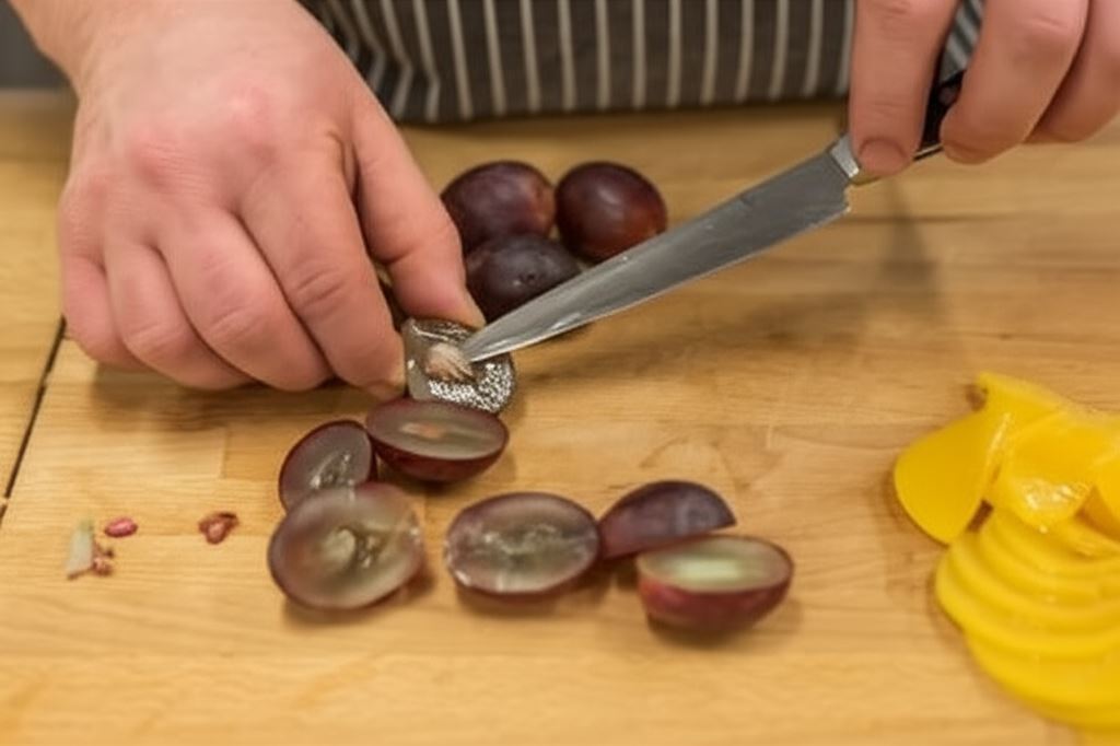 Brzoskwinie z konserwy potnij na plastry, winogrona przekrój na połówki i wyciągnij z nich pestki.