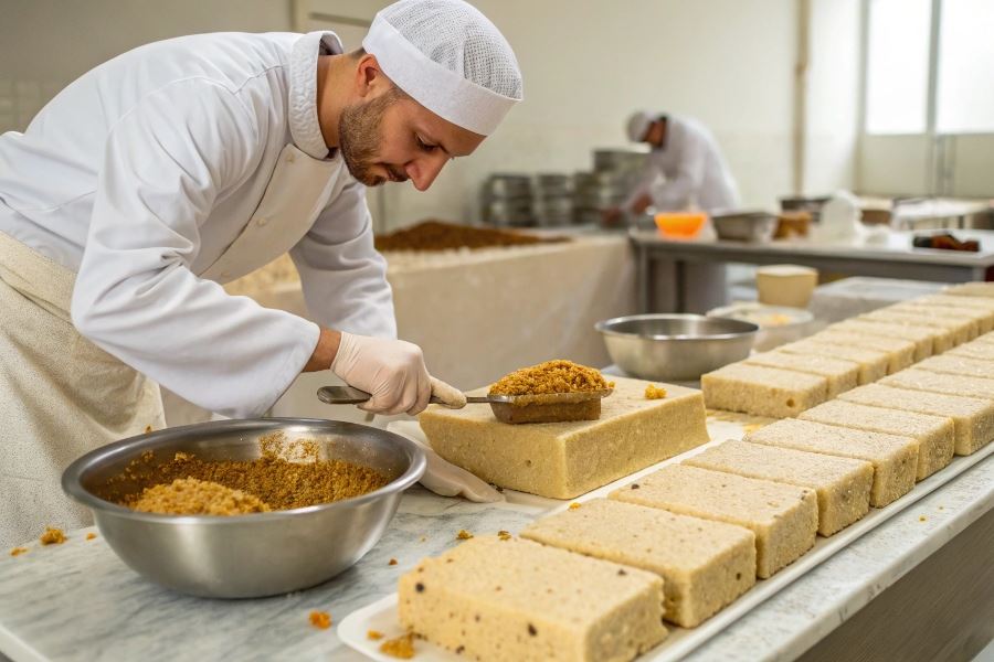 Przemysłowa produkcja chałwy rozpoczyna się od precyzyjnego prażenia i mielenia ziaren sezamu w temperaturze 160-180°C, co uwydatnia ich aromat. Następnie tahini jest mieszane z syropem cukrowym (często wzbogaconym o glukozę dla lepszej stabilności) oraz substancją spieniającą – tradycyjnie ekstraktem z korzenia mydlnicy lekarskiej, a w produkcji przemysłowej często ekstraktem z korzenia lukrecji lub białkiem jaja.