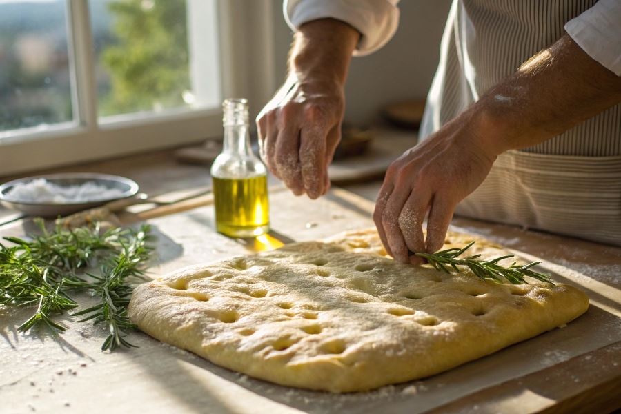 Aby odświeżyć focaccię, skrop ją lekko wodą i podgrzej w piekarniku w temperaturze 180°C przez 5 minut. Nigdy nie przechowuj jej w lodówce – najlepiej zawinąć w papier lub ściereczkę i trzymać w chlebaku maksymalnie 2 dni.