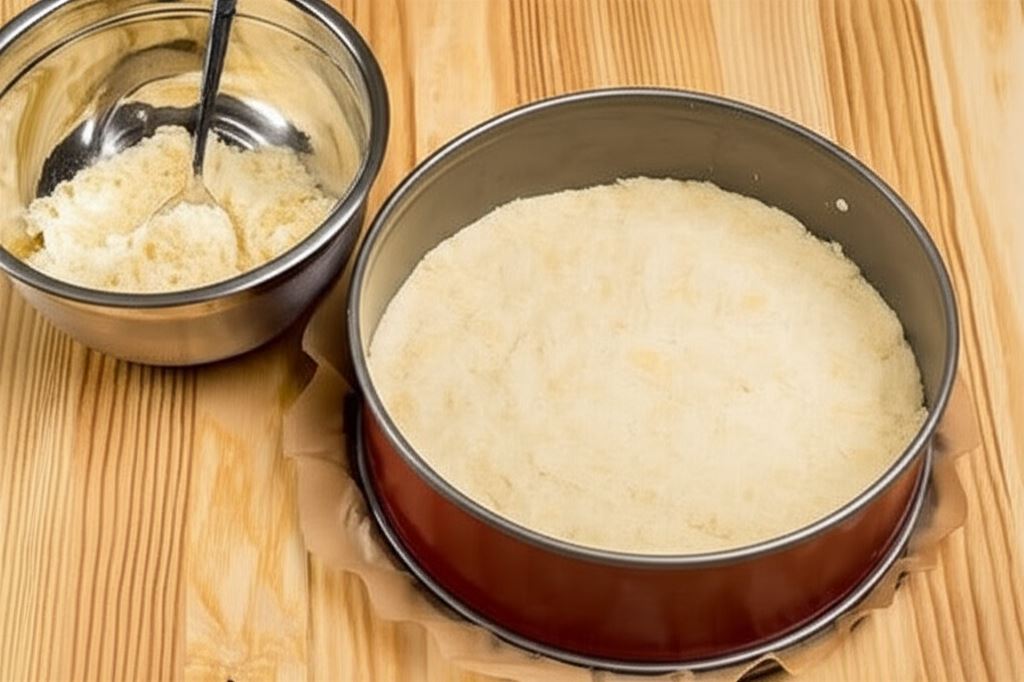 Wyłóż połowę kruszonki na dno tortownicy o średnicy około 22cm wyłożonej pergaminem, delikatnie dociskając. Pozostałą kruszonkę rozsyp swobodnie na drugiej blaszce z pergaminem i piecz wszystko w temperaturze 170C przez około 15-20 minut, aż uzyska złoty kolor.