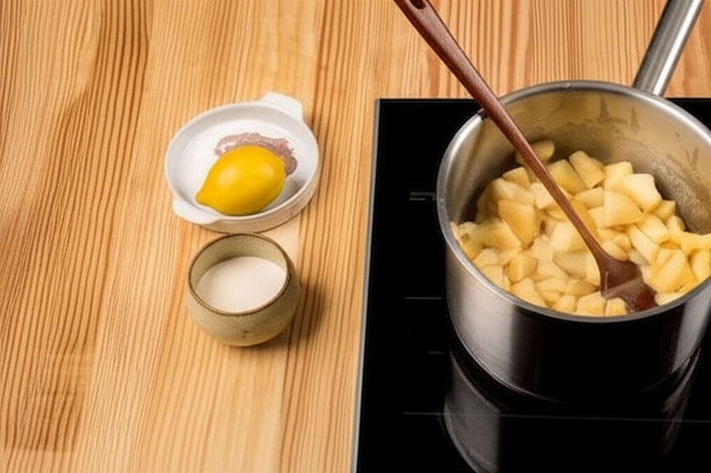 Teraz przygotuj jabłka. Wyciśnij sok z cytryny. Obierz jabłka, usuń gniazda nasienne i pokrój w kostkę około 1cm. W szerokim rondlu rozgrzej masło z cynamonem Knorr. Dodaj jabłka, kaszę mannę, oraz puree. Duś przez 3-4 minuty. Zdejmij z ognia, wlej sok z cytryny i wymieszaj delikatną łyżką.