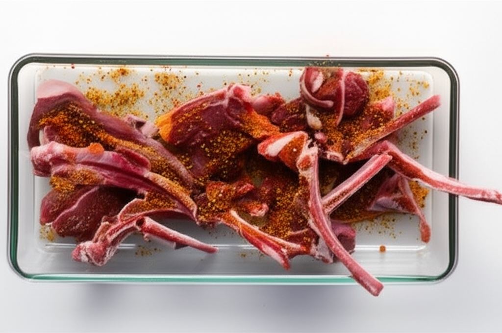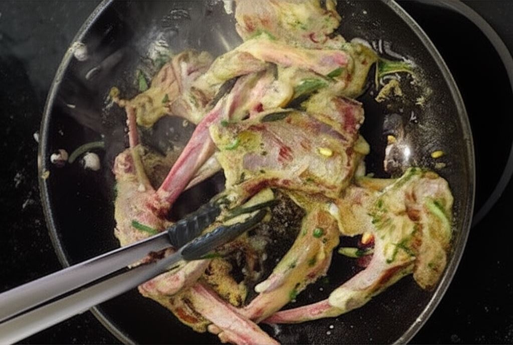 Jagnięcinę dzielimy na mniejsze kotleciki. Posypujemy czarnym pieprzem i Delikatem do mięs Knorr. Marynujemy w musztardzie z czosnkiem oraz rozmarynem. Odkładamy na 12 godzin do lodówki.