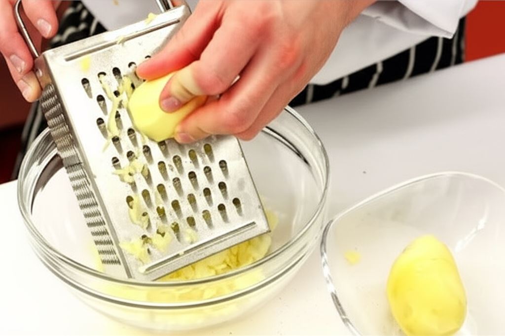 Ziemniaki gotujemy w mundurkach około 5-8 minut. Podgotowane ziemniaki obieramy i ścieramy na tarce z grubymi oczkami. Starte ziemniaki umieszczamy na rozgrzanej patelni z małą ilością tłuszczu. Kształtujemy placek, który smażymy z obu stron na złocisty kolor.