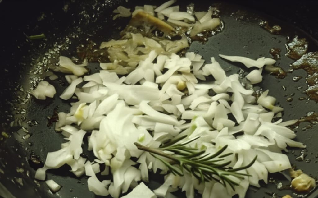 Usuwamy z patelni i na tej samej tłustości podsmażamy posiekaną cebulę oraz gałązkę rozmarynu.