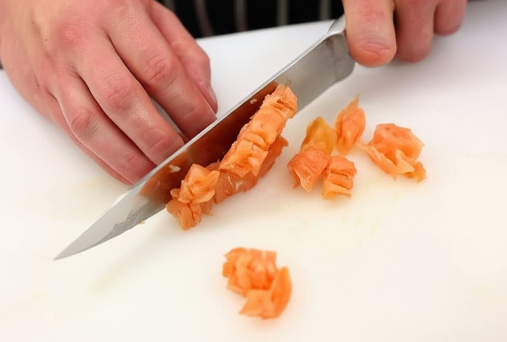 Potnij łososia w kostkę.