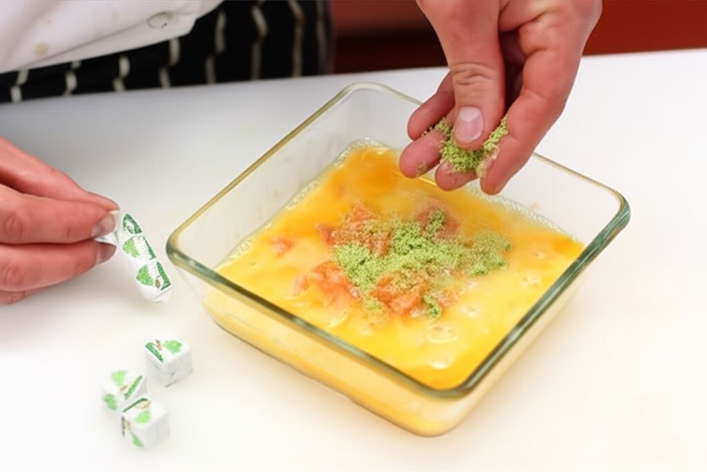 Ubij jajka, wsyp do nich łososia i pokrusz przyprawę w mini kostkach Knorr.