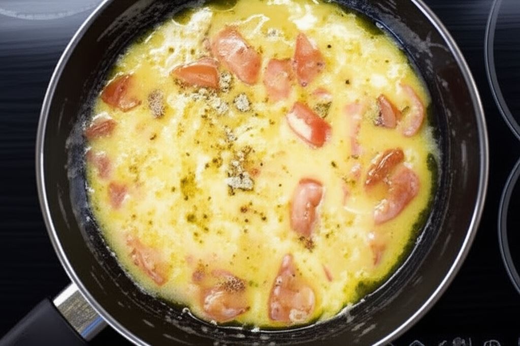 Na patelni roztop masło*, wlej jajka, a następnie dodaj pomidory.