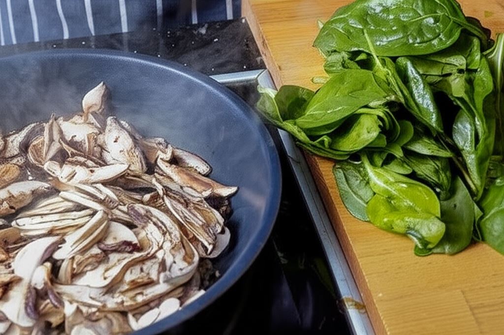 Pieczarki pokrój na cienkie plastry, szpinak opłucz. Na szerokiej patelni zrumień pieczarki z niewielką ilością soli, aż odparuje cała woda, którą zawierają.