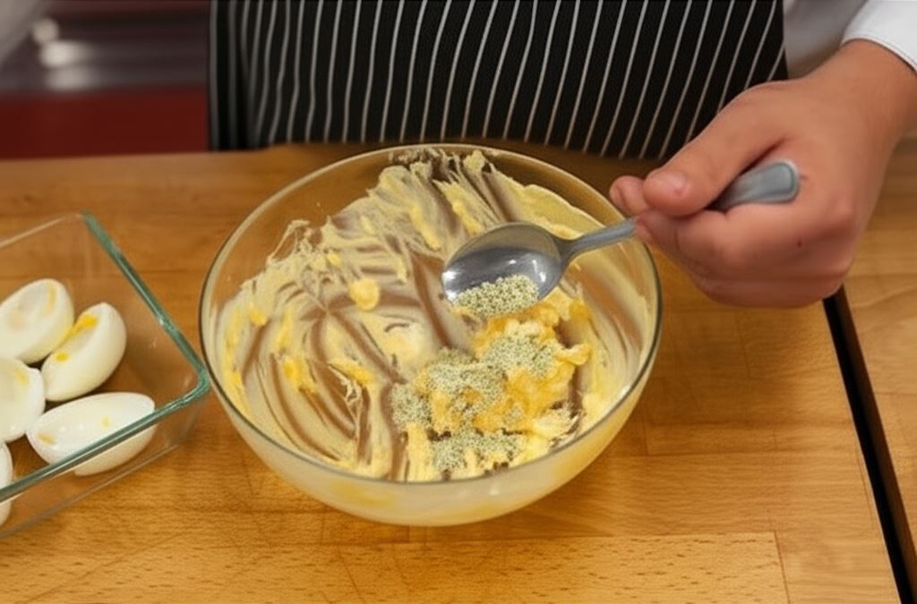 Wyjmij żółtka i połącz z majonezem do uzyskania pasty. Pastę przypraw sosem sałatkowym Knorr.