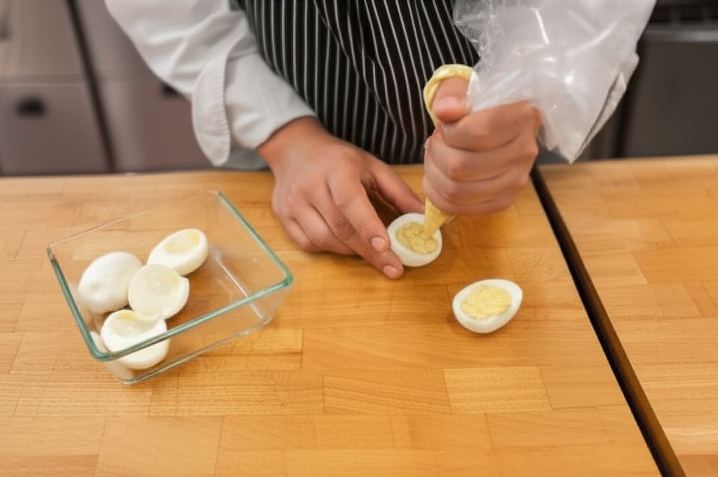 Umieść masę w torebce z uciętym rogiem i wypełniaj nią wydrążone białka.