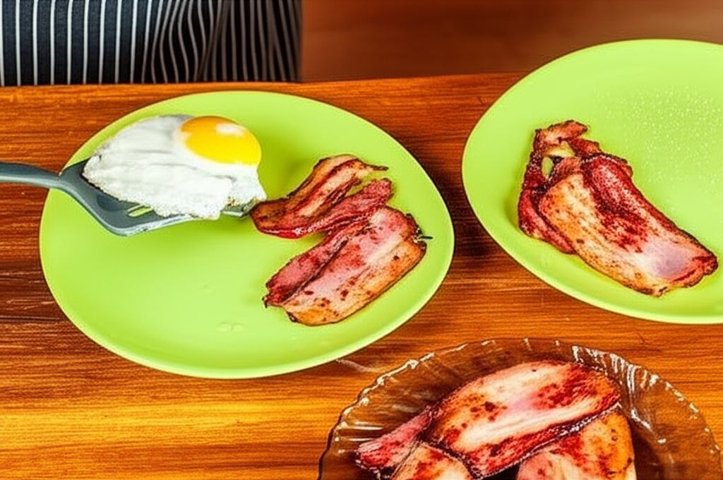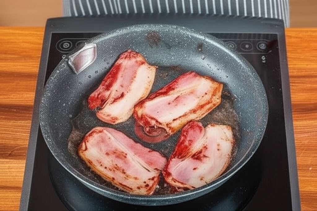 Bekon najlepiej smakuje, gdy jest smażony na suchej patelni – nie potrzebuje dodatkowego tłuszczu, ponieważ sam go wytapia podczas smażenia. Dzięki temu jajka przygotowane na tym samym tłuszczu nabierają wyjątkowego, głębokiego smaku.