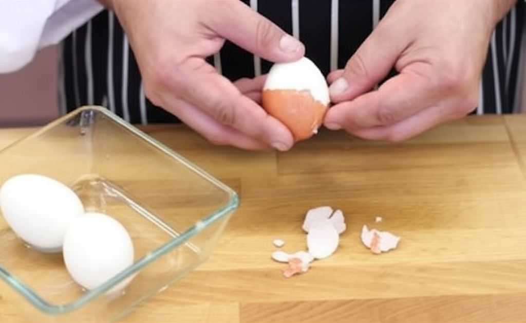 Ugotuj jajka na twardo. Potem je wystudź i obierz ze skorupek.