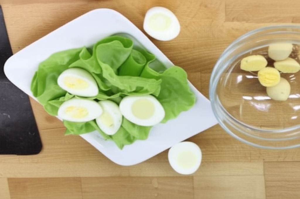 Ułóż połówki białek na zielonych liściach sałaty.