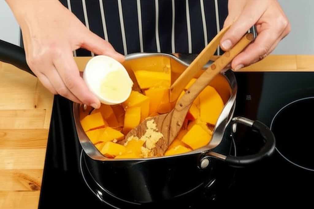 Wrzuć dynię, imbir i cukier. Podsmaż razem przez 5 min. Wlej 1 l wody i dodaj kostki bulionowe Knorr. Gotuj wszystko do miękkości, około 10 min.