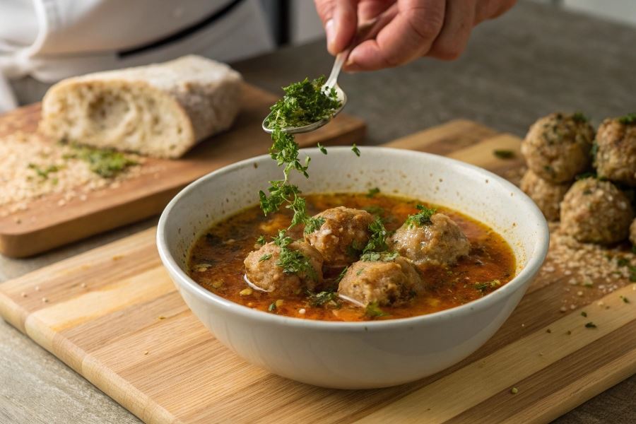 Formowanie klopsików wilgotnymi dłońmi zapobiega przywieraniu mięsa do rąk i pozwala uzyskać idealnie gładką powierzchnię, która równomiernie chłonie smak bulionu podczas gotowania.