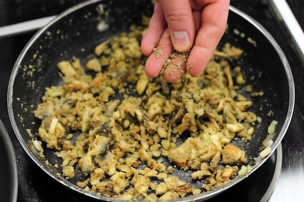 Na rozgrzanym tłuszczu na patelni zrumień pokrojoną w kostkę cebulę, posiekany czosnek oraz pieczarki pokrojone w plastry. Wsyp bułkę tartą i wszystko przypraw do smaku niewielką ilością majeranku Knorr i czarnym pieprzem.