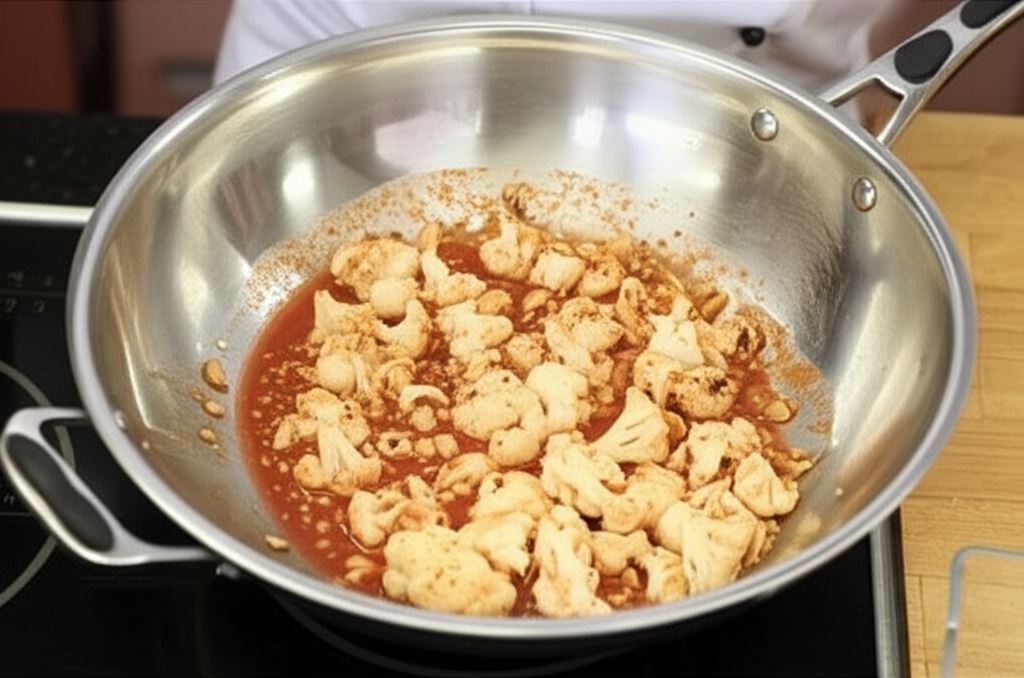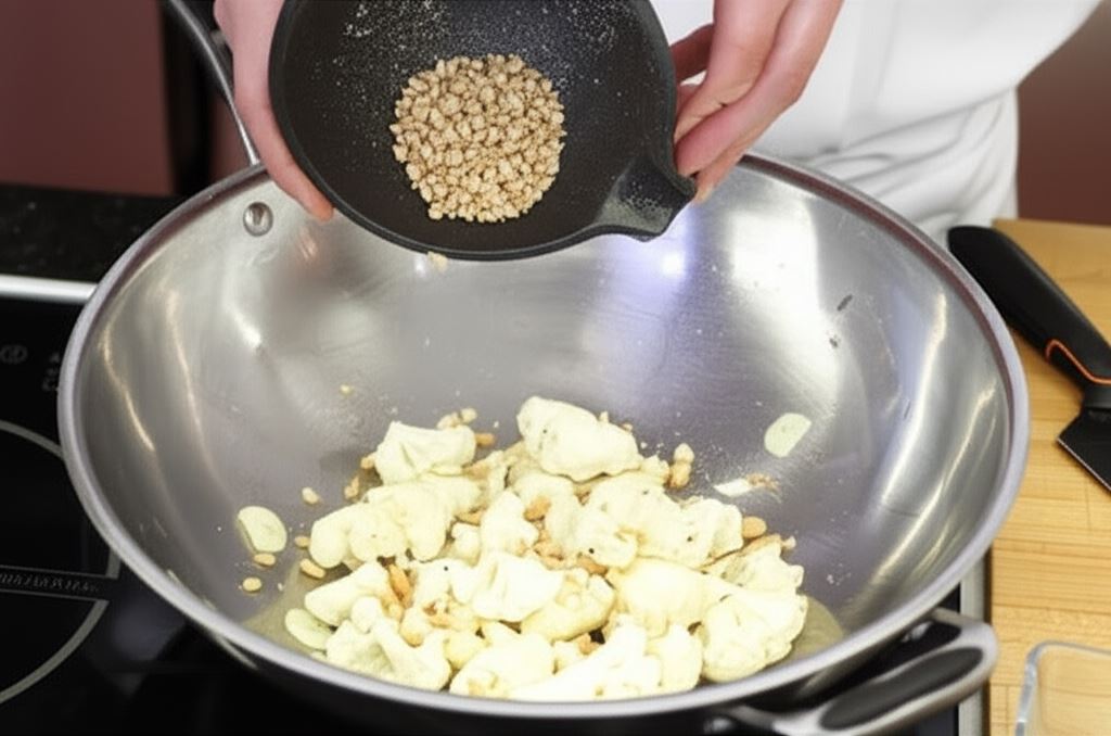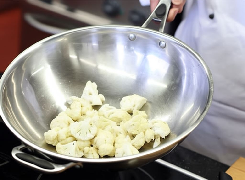 Na rozgrzanym oleju w szerokim rondlu lub woku podsmażaj różyczki kalafiora.