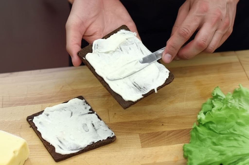 Pumpernikiel posmaruj majonezem i umieść sałatę oraz ser.