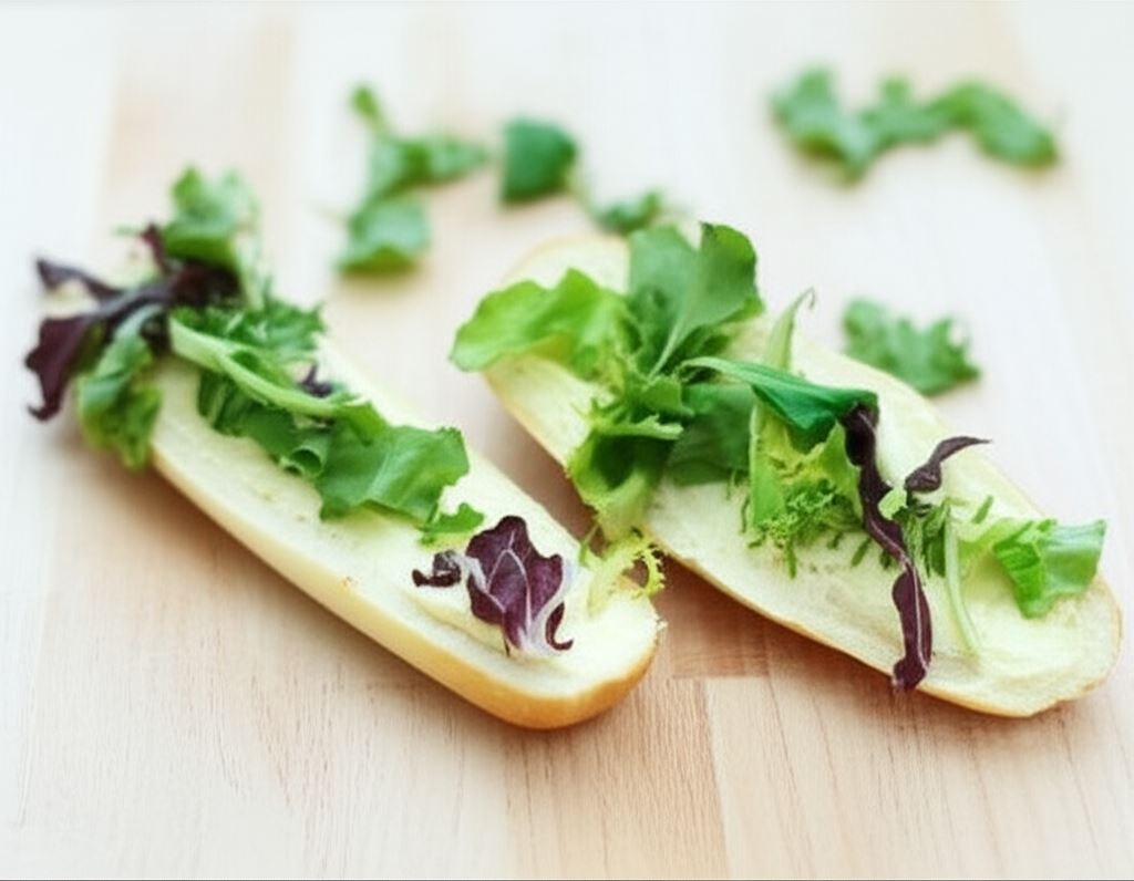 Bagietkę przekrój wzdłużnie, aby uzyskać duże kromki. Każdą posmaruj majonezem i ułóż na niej kolorowe sałaty.