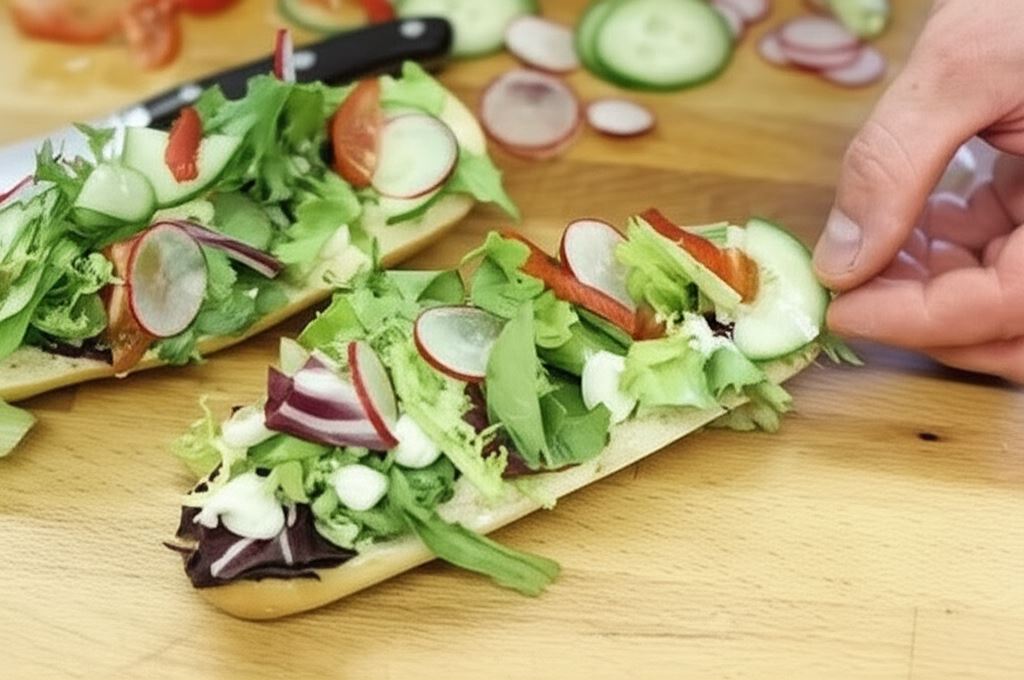 Odkryj nowy wymiar kanapek! Nasza warzywna kompozycja na bagietce to prawdziwa eksplozja kolorów, smaków i tekstur. Chrupiąca bagietka posmarowana aksamitnym majonezem, przykryta warstwą świeżych sałat i ozdobiona soczyście kolorowymi warzywami oraz słonym serem feta, stanie się Twoim ulubionym posiłkiem na każdą porę dnia.