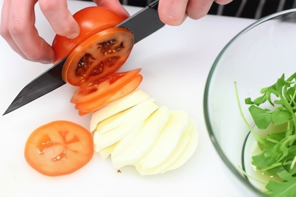 Rukolę opłucz, wysusz i połącz z oliwą. Pomidory i mozarellę potnij na plasterki.