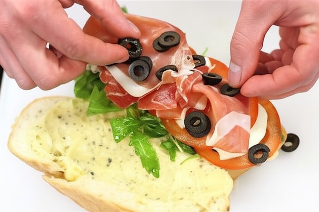 Na koniec umieść szynkę, a na górze ułóż pokrojone oliwki.