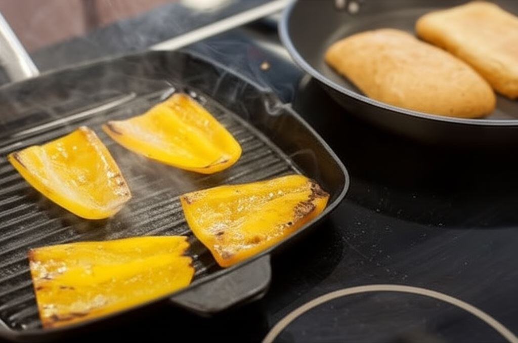 Bułki przetnij wzdłużnie na połowy i podpiecz moment w rozgrzanym piekarniku. Paprykę oczyść i pokrój na ćwiartki, skrop oliwą i zgrilluj na patelni. Pomidory oraz cebulę pokrój w cienkie plasterki.