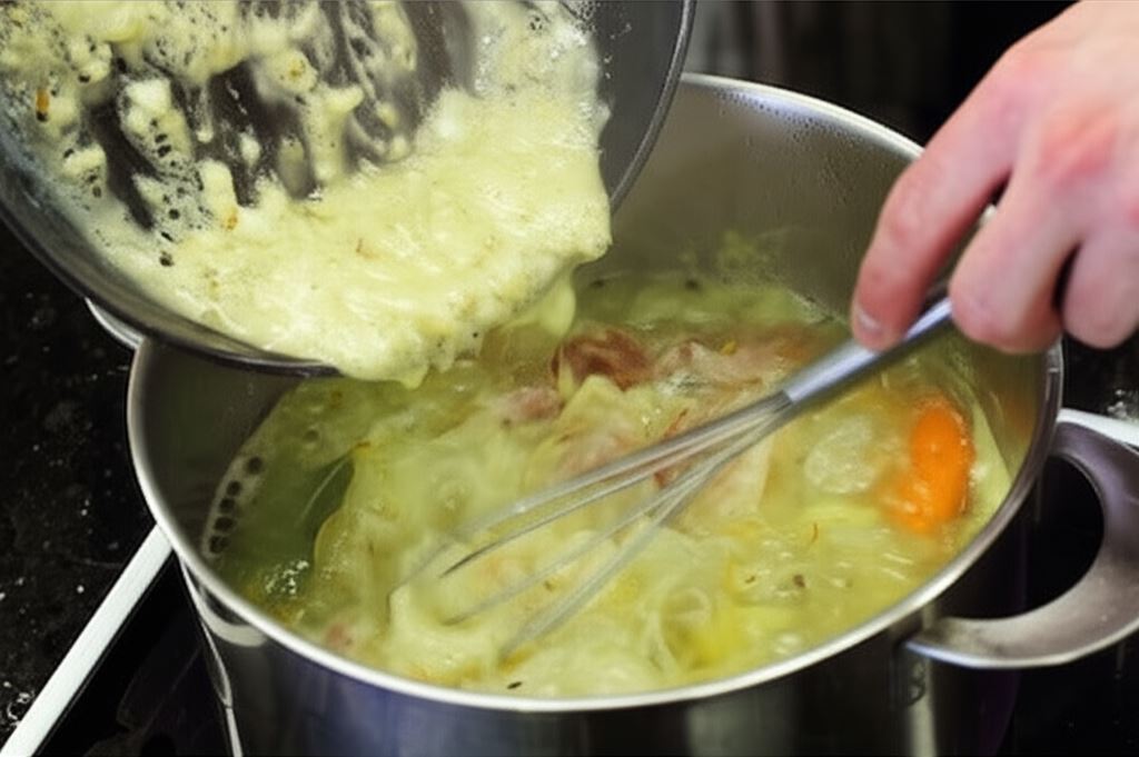 Do wrzącej zupy wsyp mąkę z cebulą, energicznie i starannie zamieszaj rozprowadzając zasmażkę.