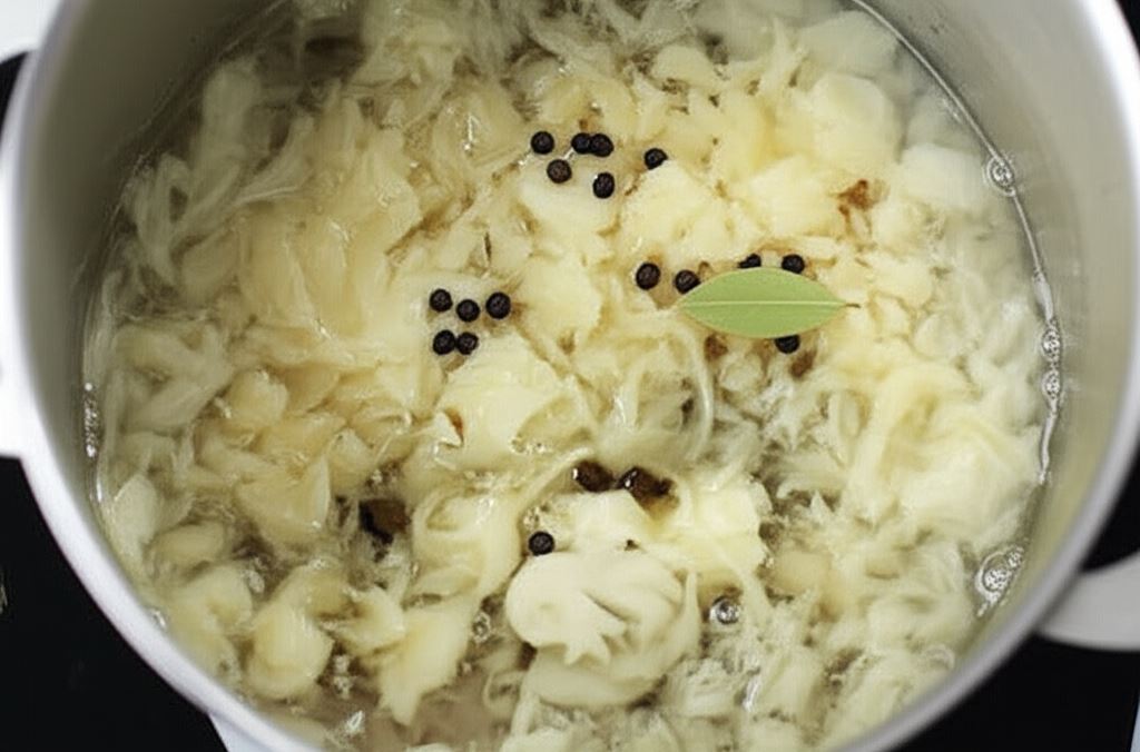 Poszatkowaną kapustę zalej 2 litrami wody. Wsyp liść laurowy, kminek, ziele angielskie i pieprz. Gotuj około 30 minut.