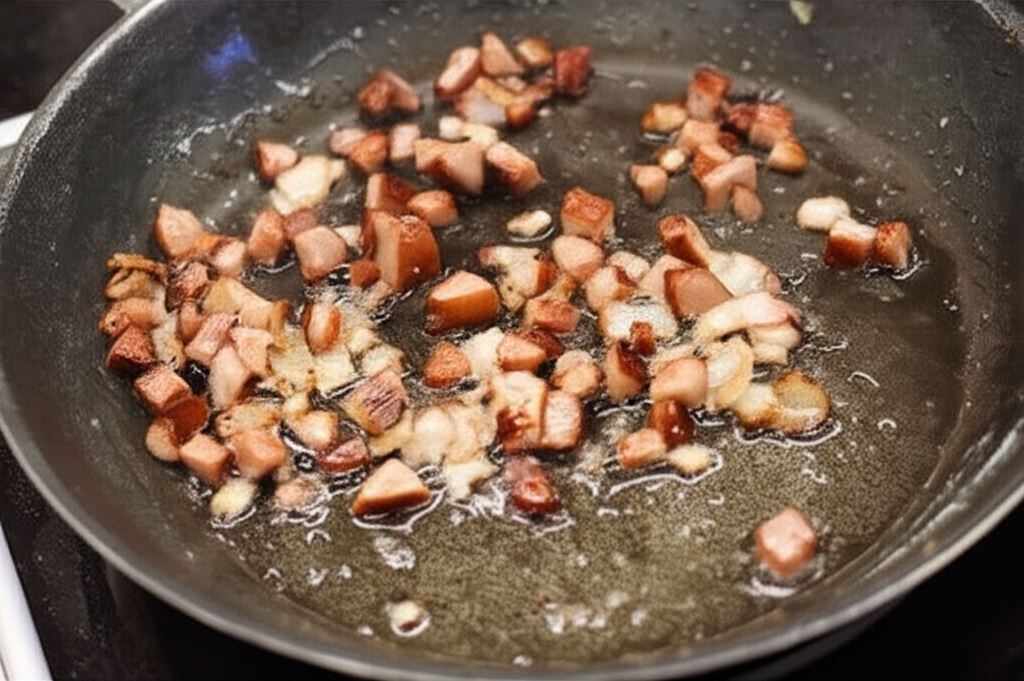 Boczek i kiełbasę pokrój w kosteczkę i zrumień na patelni. Kiedy nabiorą złotego koloru, wrzuć do zupy. Przypraw zupę majerankiem, przeciśniętym przez praskę czosnkiem i kostką Bulionu na włoszczyźnie Knorr. Gotuj wszystko jeszcze przez około 20 minut na wolnym ogniu. Serwuj z pieczywem.