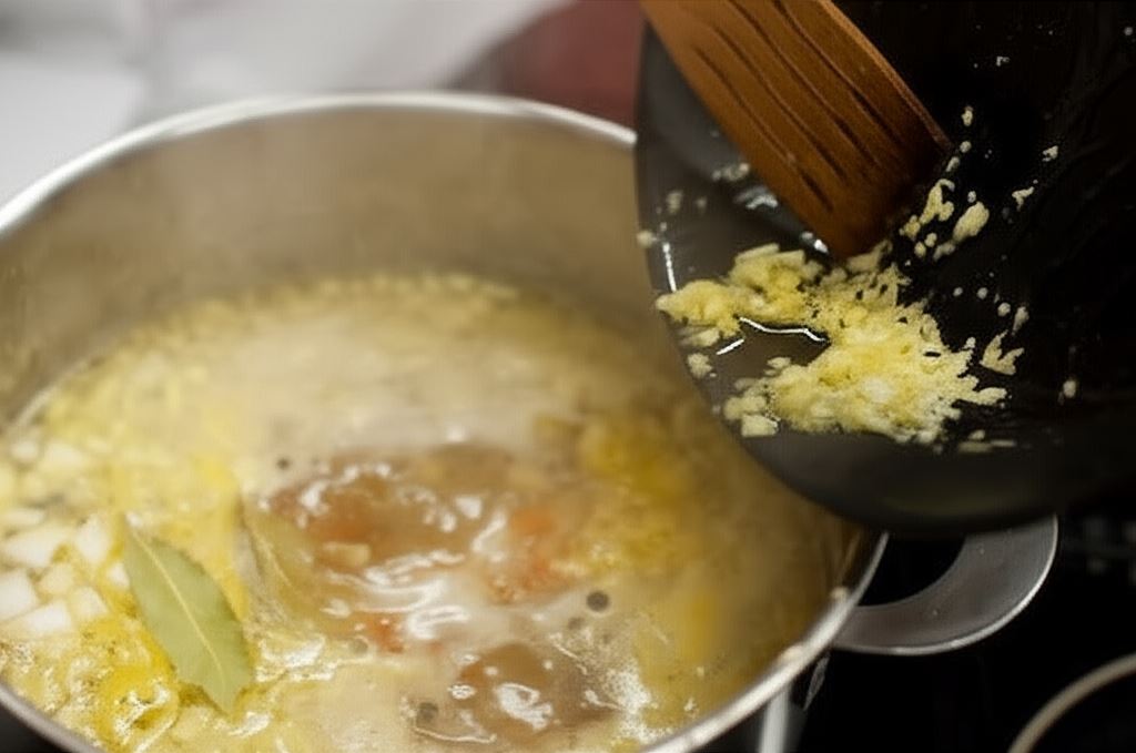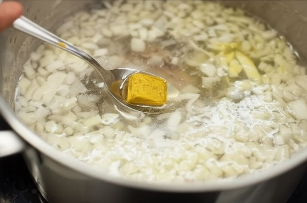 Cebulę posiekaj na drobno, podsmaż moment na maśle, wsyp do zupy. Trzeba pilnować, by masło nie przypaliło się, bo inaczej potrawa będzie niesmaczna i szkodliwa. Wrzuć liście laurowe i gotuj przez około 20 minut.