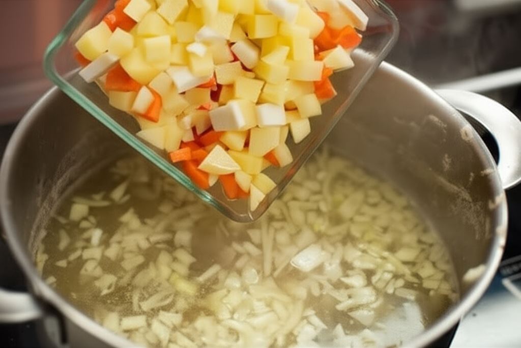 Obierz ziemniaki, marchew i pietruszkę. Pokrój w kosteczkę i dodaj do rosołu.