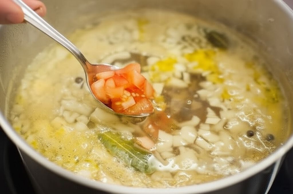 Sparz pomidory, zdejmij skórkę, pokrój w kostkę i tuż przed zakończeniem gotowania dodaj do garnka. Przypraw pieprzem i solą wedle smaku. Wyjmij mięso z rosołu, ostudź, pokrój w kostkę i umieść ponownie w zupie.