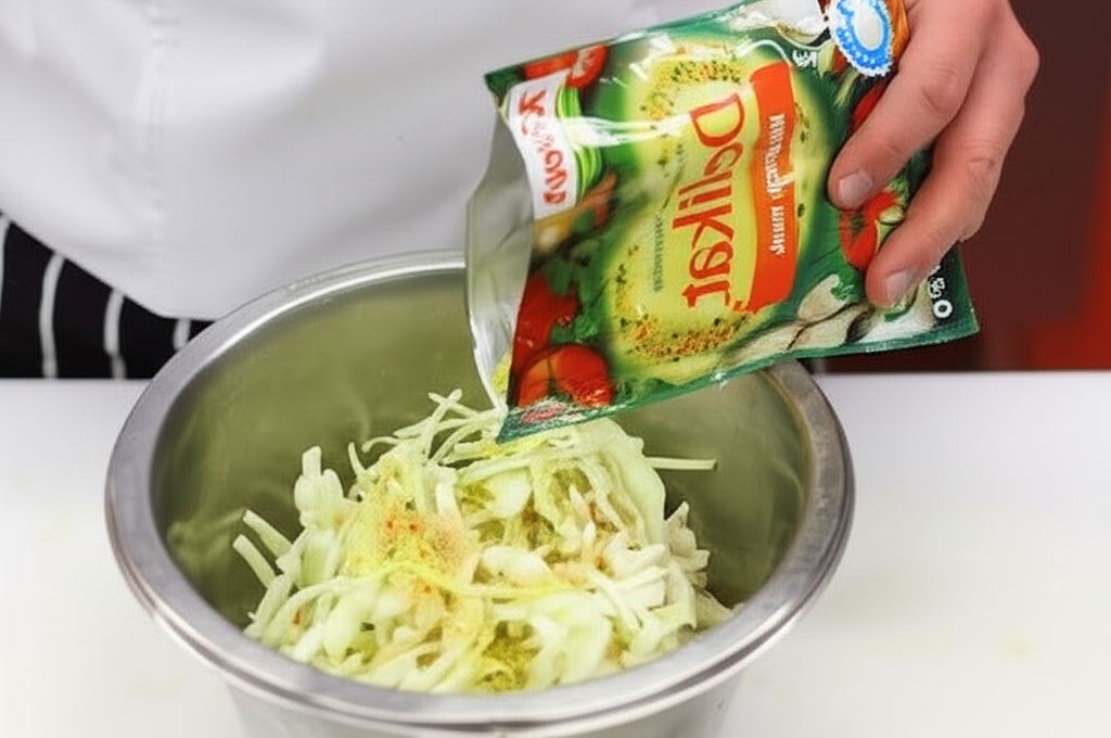 Kapustę opłucz, odcedź i poszatkuj na niezbyt długie paski. Włóż ją do garnka, połącz z przyprawą Knorr i cukrem, po czym odstaw na godzinę.