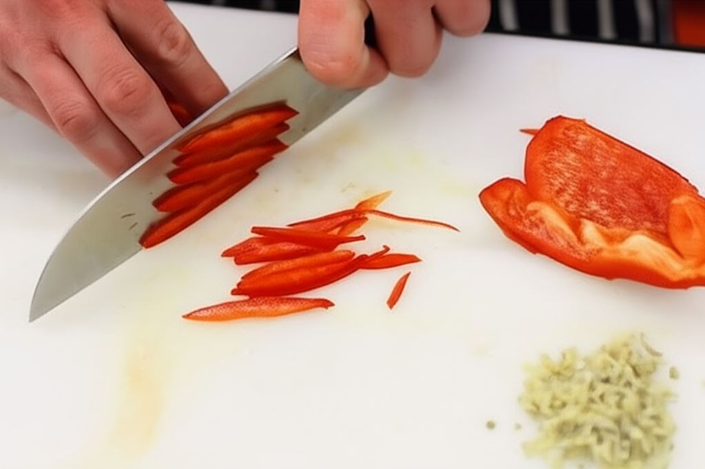 Paprykę potnij na wąskie paski, a imbir drobno posiekaj.