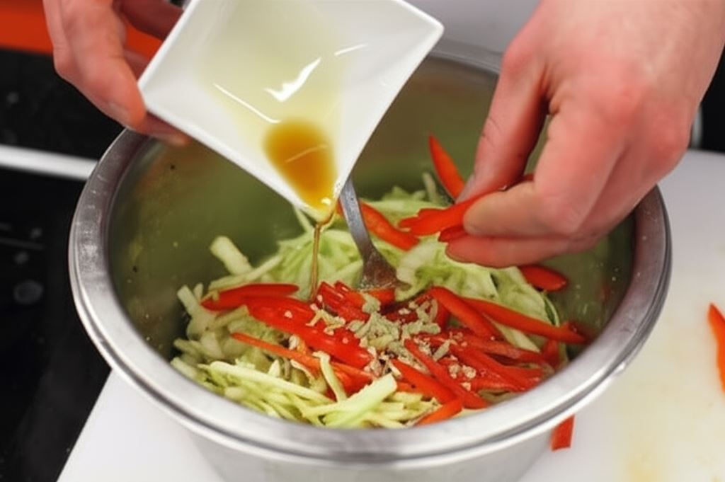 Odciśnij kapustę, dodaj ocet, olej sezamowy oraz paprykę i imbir.