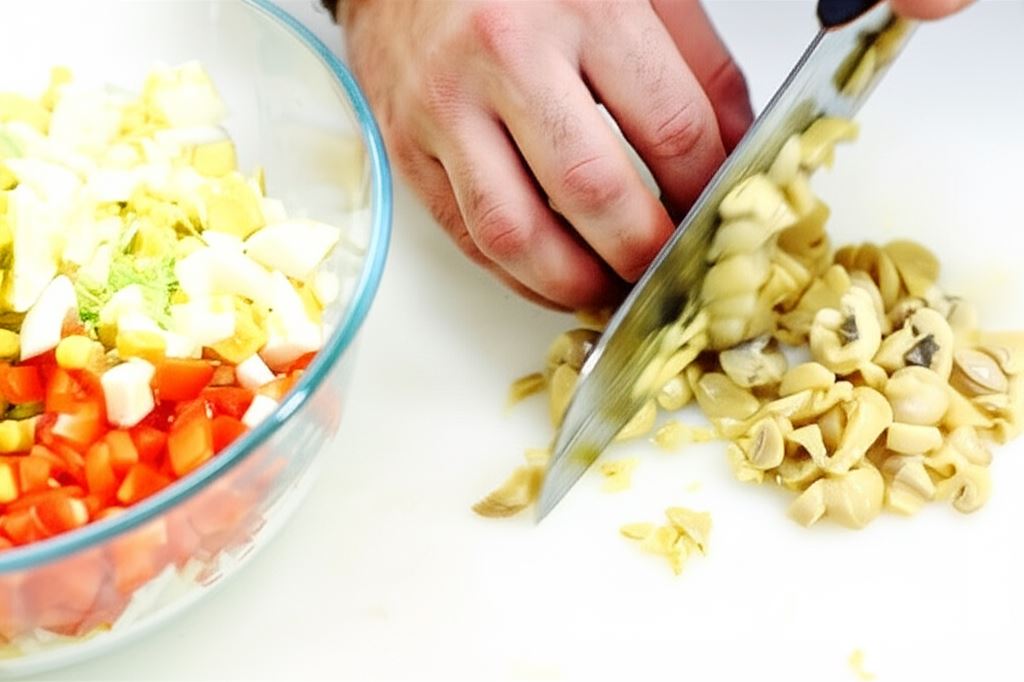 Pieczarki odsącz z zalewy i posiekaj drobno. Wsyp do reszty składników.