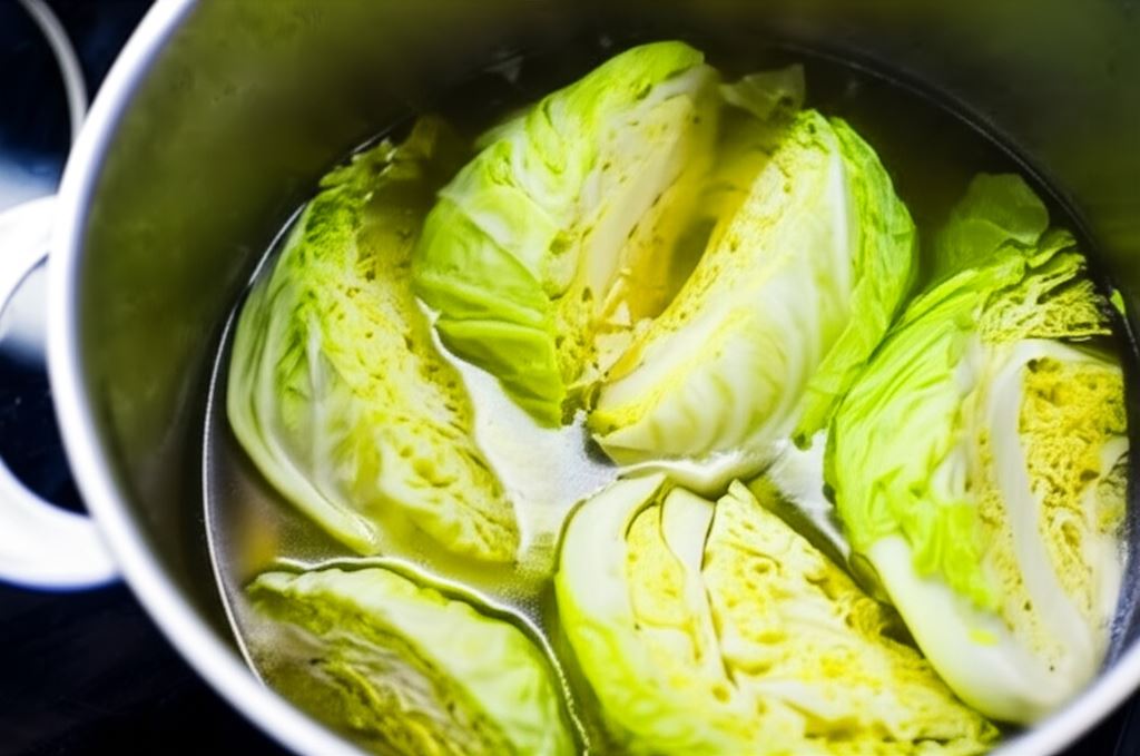 Podziel kapustę na ćwiartki. Ugotuj w bulionie przez około 15 minut, wyjmij z garnka i pozostaw do ostygnięcia.
