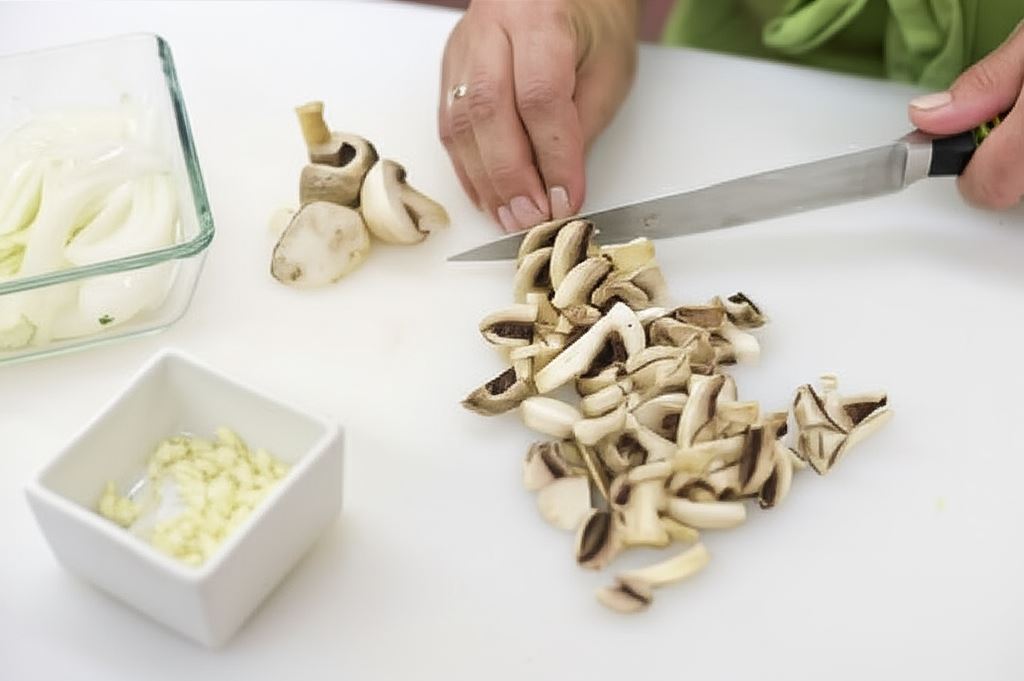 Cebule posiekaj w piórka, czosnek drobno pokrój, pieczarki podziel na półplastry.