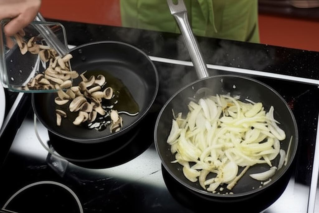 Na rozgrzanym tłuszczu zeszklij cebulę i czosnek. Osobno przesmaż pieczarki.