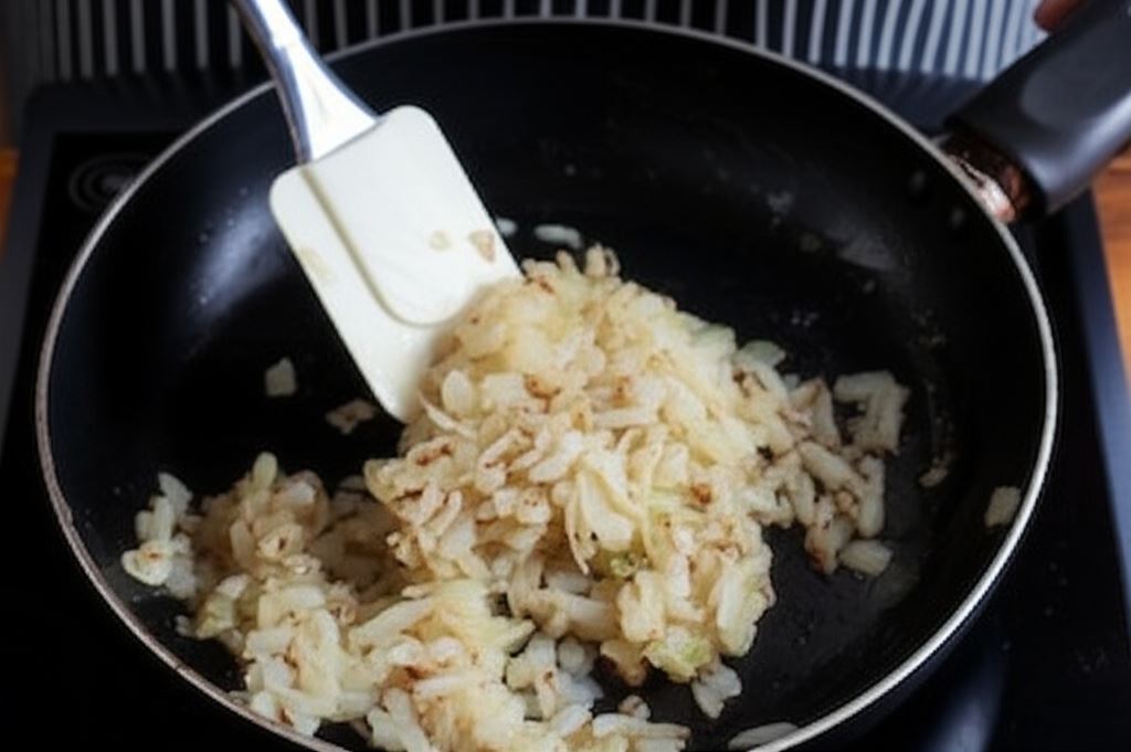 Cebulę posiekaj w kostkę, czosnek drobno pokrój. Całość zrumień na złoty kolor dodając pokruszony liść laurowy i margarynę.