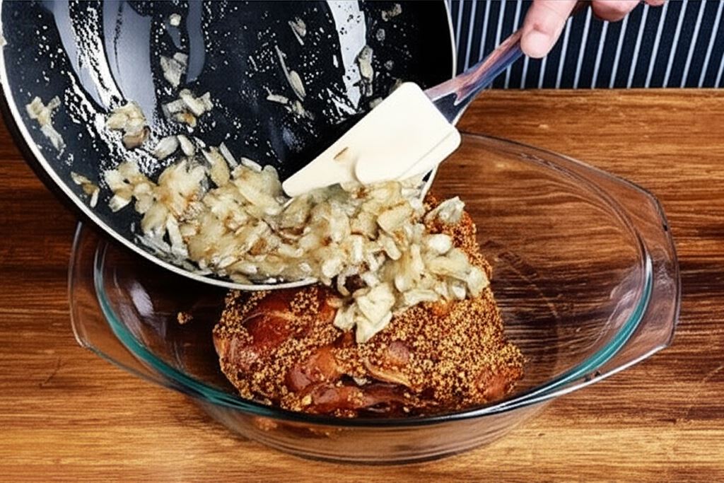 Karkówkę umieść w naczyniu żaroodpornym, polej podsmażonymi składnikami i dokładnie przykryj.