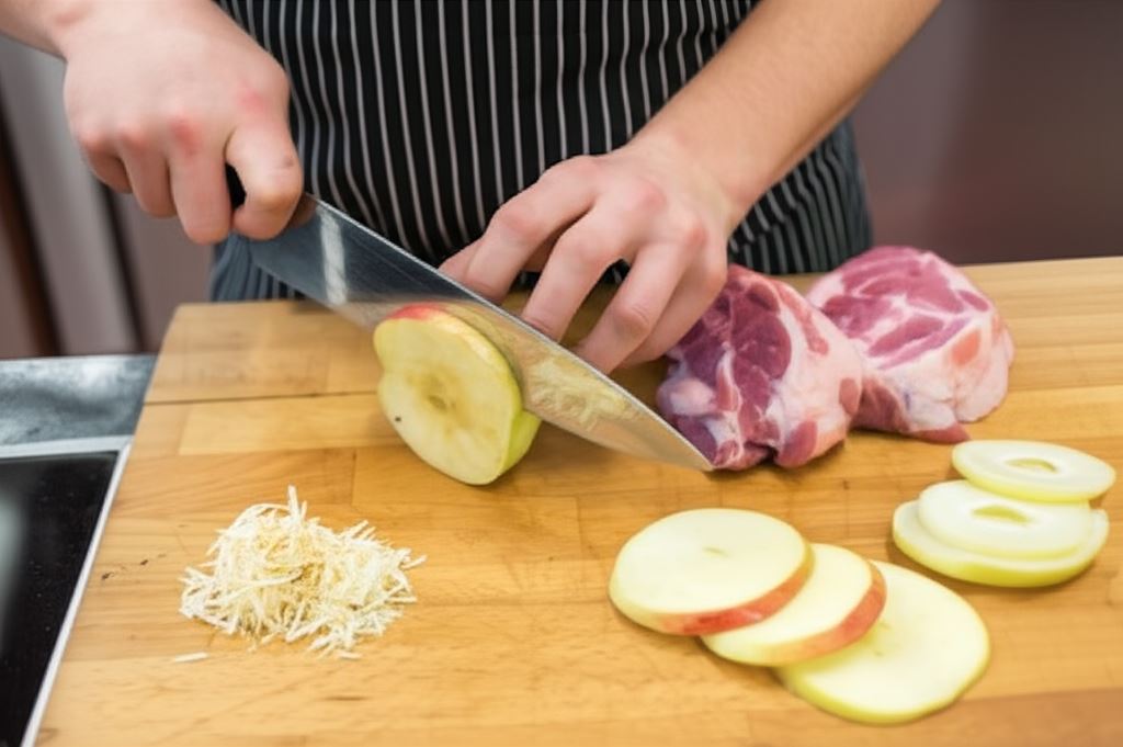 Karkówkę potnij na grube steki, minimum 2 cm. Jabłka pokrój w grubsze plastry o grubości centymetra i usuń z nich gniazda nasienne. Cebulę pokrój również w podobnej grubości plastry, oscypka zetrzyj na tarce, a dwie gałązki rozmarynu drobno posiekaj.
