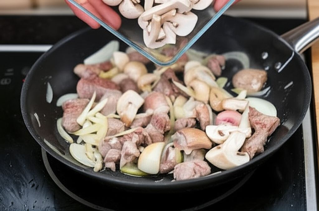 Rozpocznij smażenie karkówki, następnie wsyp cebulę i pieczarki. Smaż do momentu, gdy całość nabierze rumianego koloru.