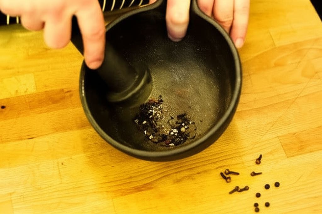 W moździerzu rozdrobnij na duże kawałki czarny pieprz oraz goździki.