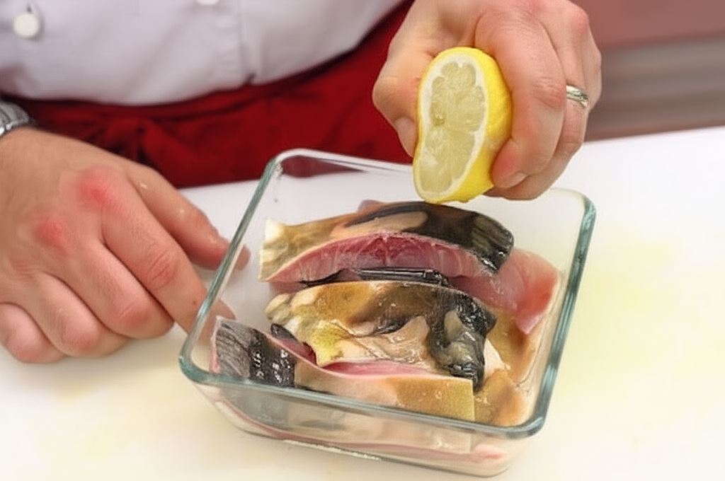 Rybę opłucz i osusz. Od środka i na zewnątrz skrop sokiem cytrynowym.